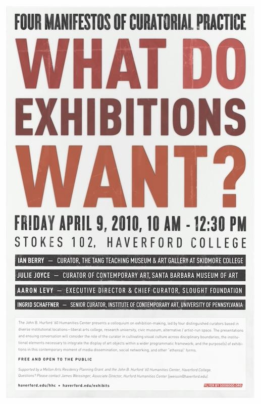 Each participant will present a manifesto of curatorial practice. These presentations will be followed by an open conversation among the four presenters and audience members, considering the role of the curator in cultivating visual culture across disciplinary boundaries; the institutional elements necessary to integrate the display of art objects within a wider programmatic framework of interdisciplinary inquiry, experimentation, critique, or activism; and the purpose(s) of exhibitions in this contemporary moment of media dissemination, social networking, and other “ethereal” forms.